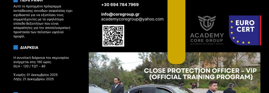 Το πρόγραμμα παρέχει ολοκληρωμένη θεωρητική και πρακτική εκπαίδευση για συνοδούς ασφαλείας με εξειδίκευση στην προστασία υψηλών προσώπων (VIP). Στόχος είναι οι εκπαιδευόμενοι να αποκτήσουν επαγγελματικές γνώσεις και δεξιότητες ώστε να εργάζονται αποτελεσματικά σε υπηρεσίες προσωπικής ασφάλειας, συνοδείας και διαχείρισης κινδύνων.